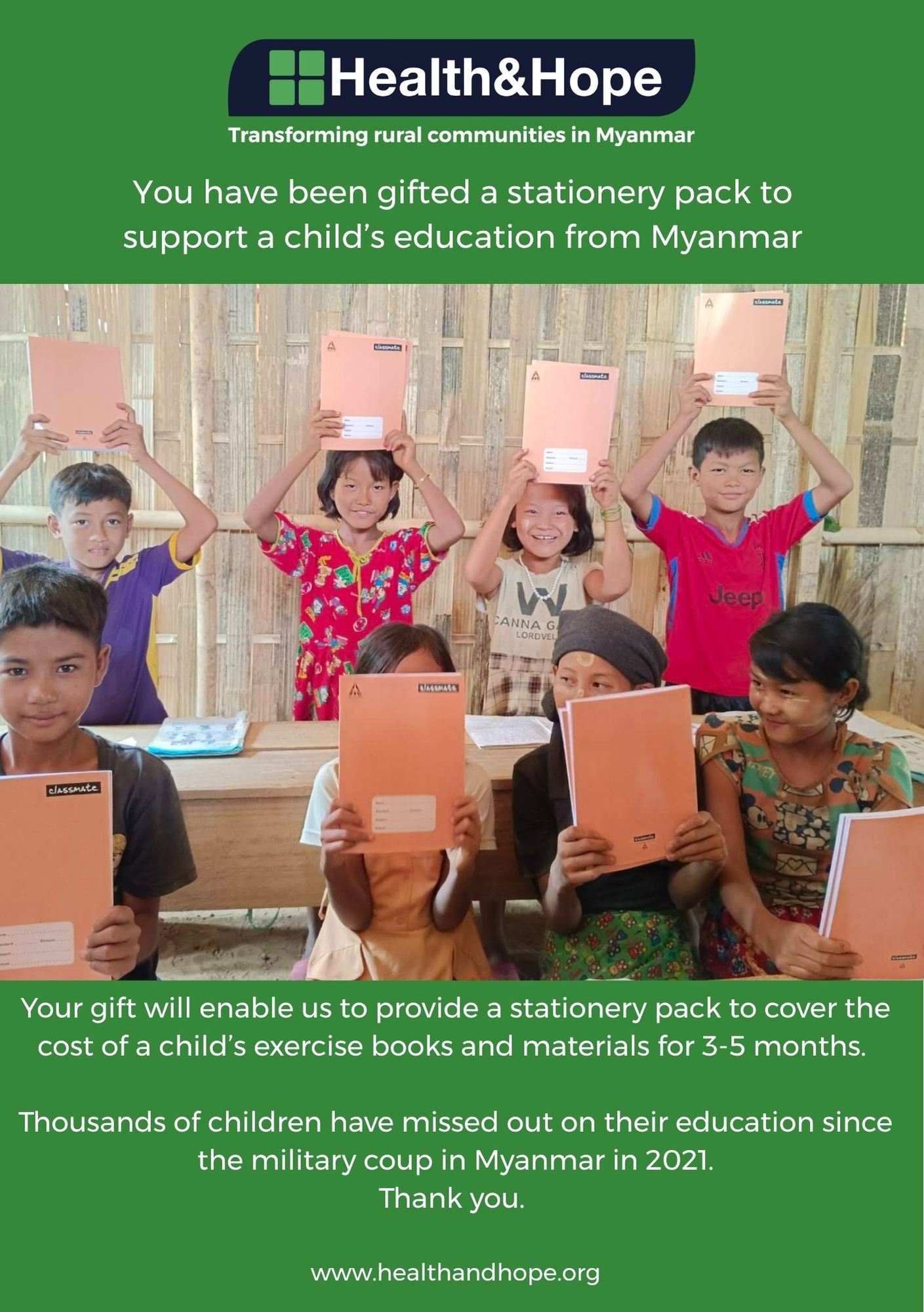 Your gift will enable us to provide a stationery pack to cover the cost of a child’s exercise books and materials for 3-5 months.