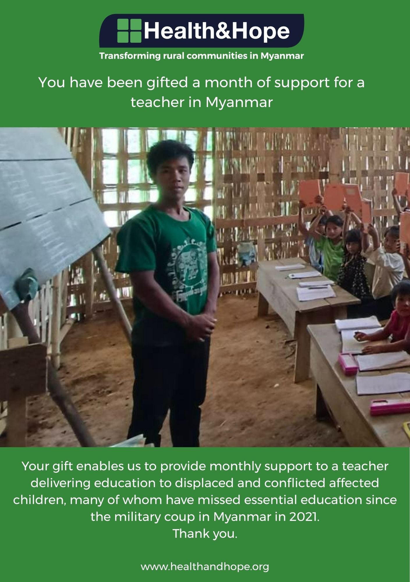 Your gift enables us to provide monthly support to a teacher delivering education to displaced and conflicted affected children, many of whom have missed essential education since the military coup began in Myanmar in 2021.